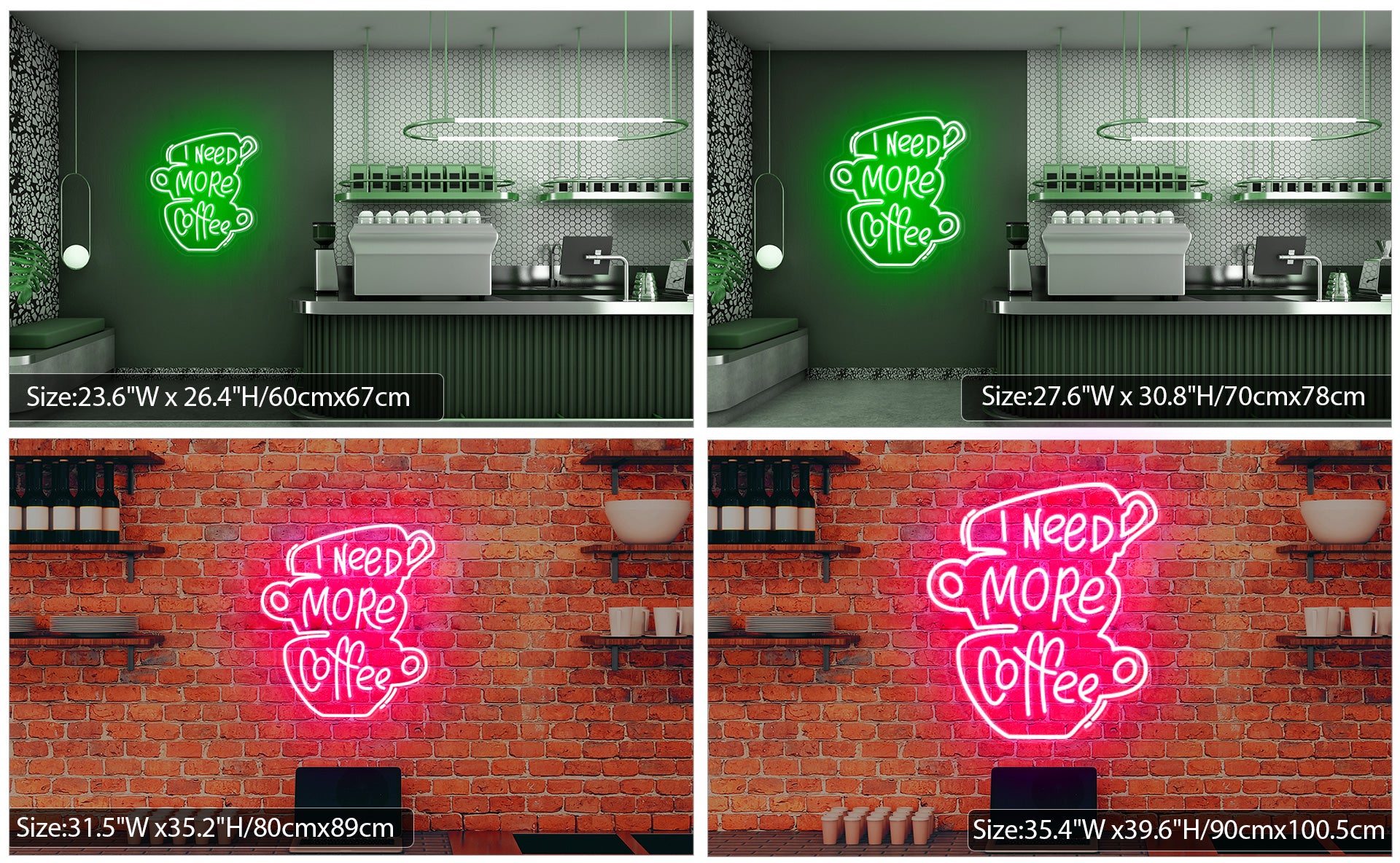 Buy 'I need more coffee personalized neon sign' for cafe or any business is perfect! Very bright but have free dimmer so that you can enjoy adjustable brightness, That's also a funny selfie backdrop for clients, For an eye-catching way to increase business.You can’t beat the price!! Buy now!This was an amazing purchase!