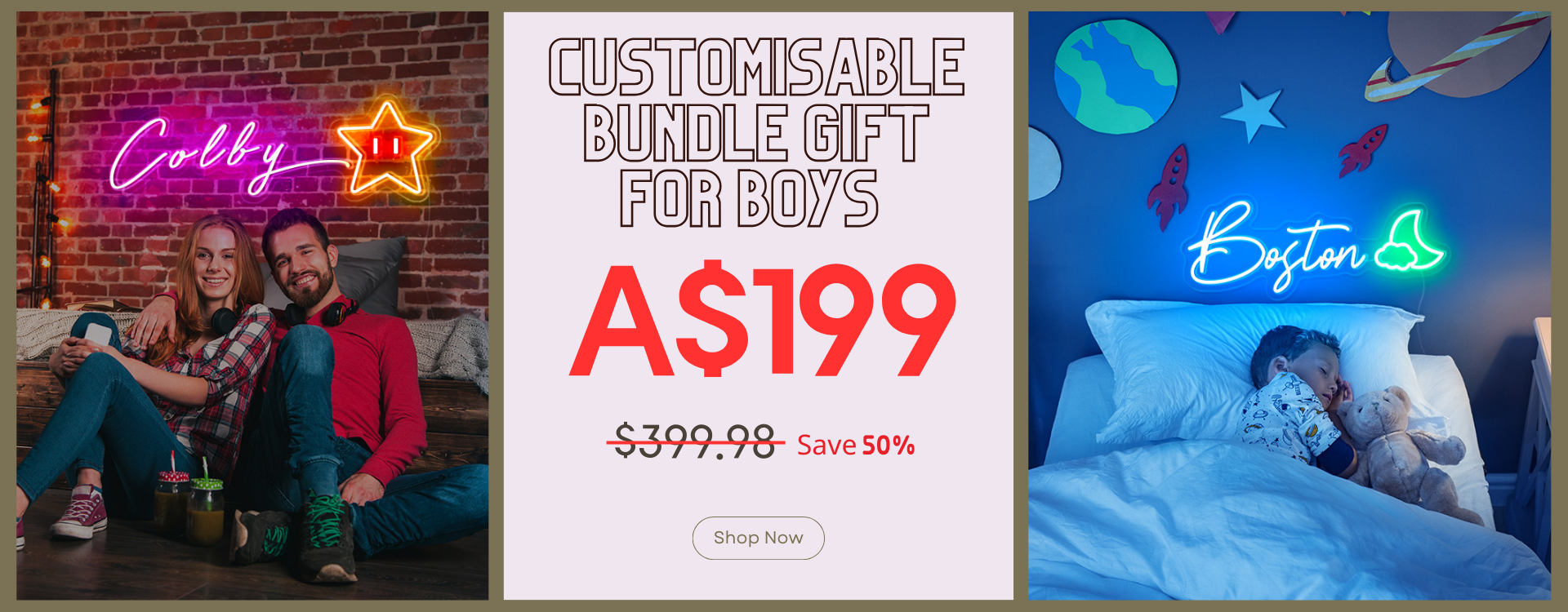 Introducing our cool and captivating Neon Sign Gift Bundle for Boys, specially crafted for families with two sons! This incredible set features two 50cm custom name signs. One sign showcases a bold star design, while the other depicts a mesmerising night sky.