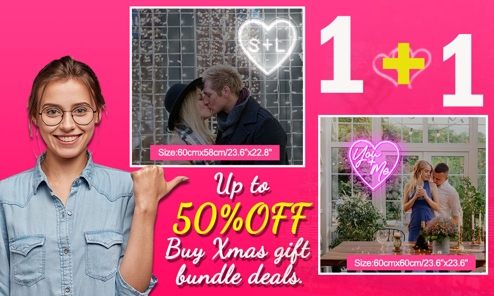 Are you looking for a amazing gift for your partner? this "LOVE "Bundle gift box really perfect!this gift set has 50% OFF now!That is Unbeatable price and you can custom your first name,of caurse,you can choose the colour,This gift box contains one personalized heart Neon decor light and Heart (You + Me) love neon sign