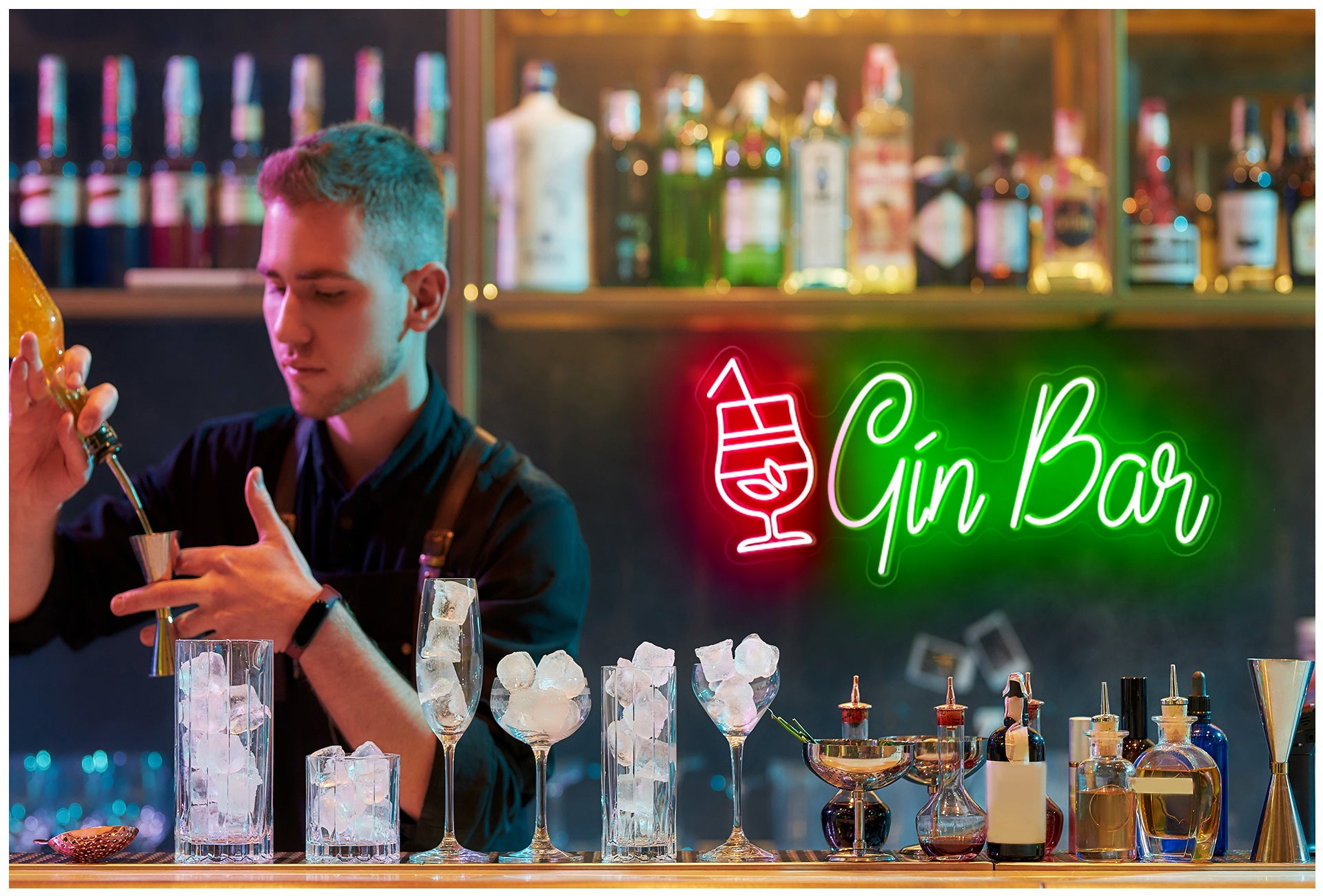 Take your happy hour to the next level with our Gin Bar with Glass Neon Sign. Featuring a beautiful script font and hurricane cocktail glass, it’s the perfect sign to light up when you’re entertaining!
