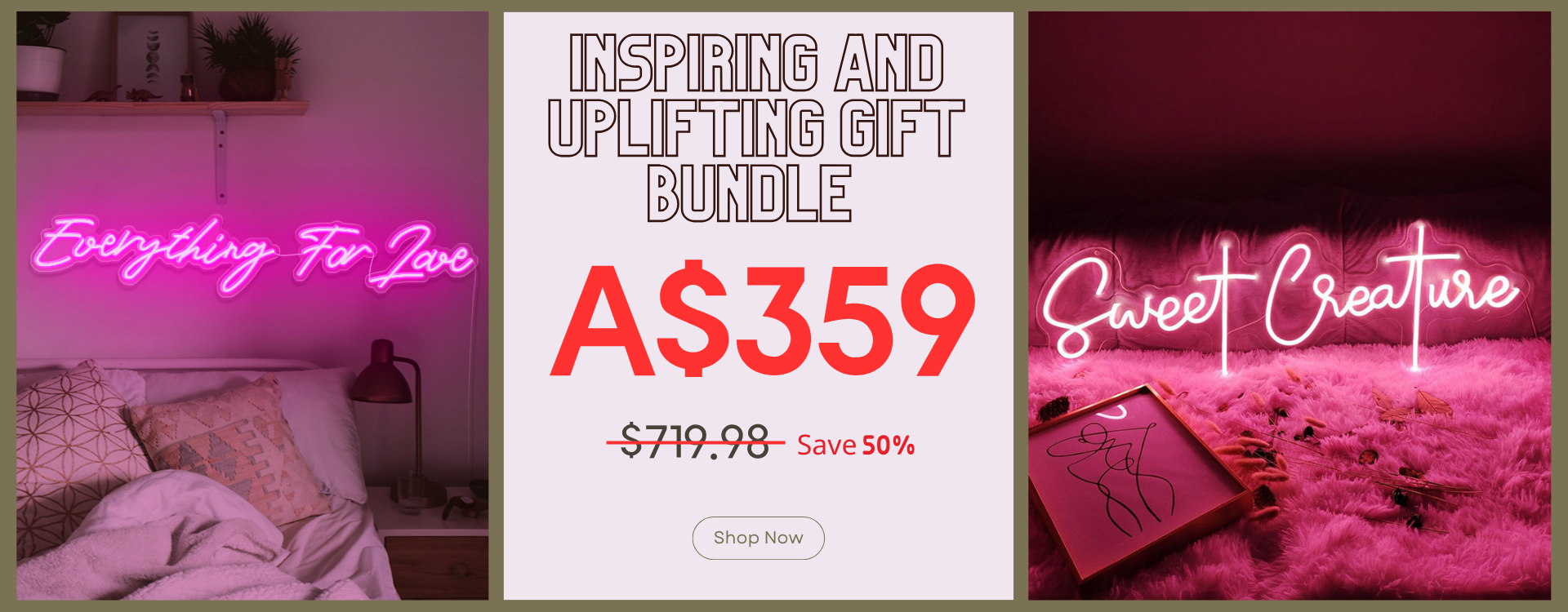 Introducing our Inspiring and Uplifting Gift Bundle, a collection that radiates positivity, love, and inspiration. This extraordinary set includes two magnificent 75cm neon signs. One is our Sweet Creature Neon Sign, a symbol of tenderness and kindness. The other is our Everything For Love Neon Sign, a beacon of love and unity.